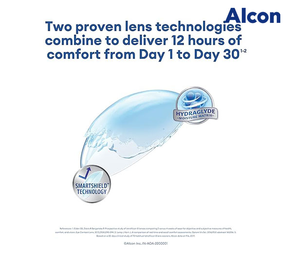 AIR OPTIX plus HydraGlyde Contact Lenses by AlconHelps have two technologies to help shield against irritating deposits as well as retain moisture throughout the day. 30-day lenses that provide moisture and comfort.Innovative Aqua moisturizing system for all day long wearing comfort.Permanent plasma surface treatment for 30 days of continuous comfort Excellent oxygen transmissibility (138) for healthy, whiter and brighter eyes