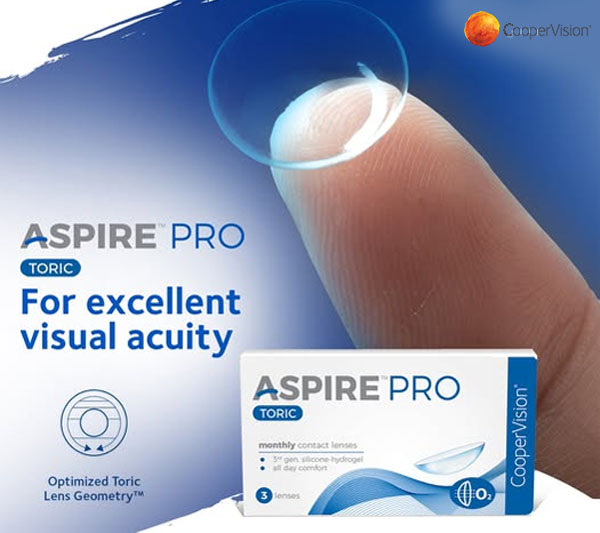 If you have astigmatism and demand exceptional quality, turn to Aspire™ PRO toric lenses by CooperVision, a world leader in toric contact lenses. Aspire™ PRO toric offer a remarkable balance of comfort, breathability and excellent visual performance They feature a unique toric design for a dependably stable fit. And they’re made with CooperVision® Aquaform® Technology which provides 100% of the oxygen your eyes need* to help them stay healthy2, and give your eyes natural wettability and premium comfort throughout your busy days.