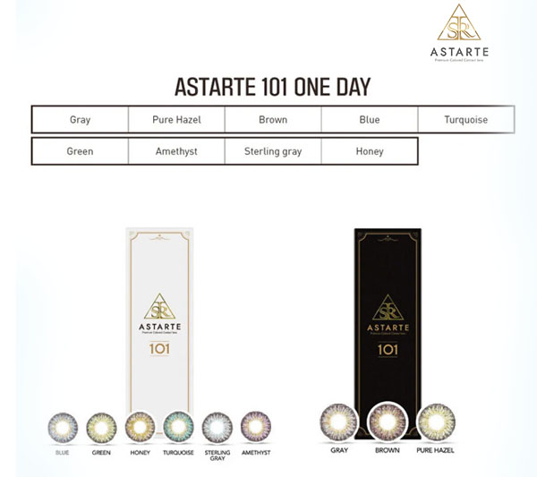 "ASTARTE 101 is a brand name for colored contact lenses. Our company started as a consignment manufacturer of a world famous contact lens brand(met the strictest and the most demanding quality standards as well as European certification) and now launched ASTARTE 101. It has specially developed for female consumers, through surveys and local market research. Also, it has been tested for design, material, and fit.There are 5 colors of contact lenses worn per month : Priya Gray, Natural Shine gray, London blue Topaz, Lake Louise green, and Mystic girl violet. The monthly lenses are made of silicone hydrogel. There are 9 colors of daily wear contact lenses: Gray, Pure Hazel, Brown, Blue, Turquoise, Green, Amethyst, Sterling gray, and Honey. Daily wear lenses are made of 2-HEMA material. Made with a sensual 2 or 3 tone design,